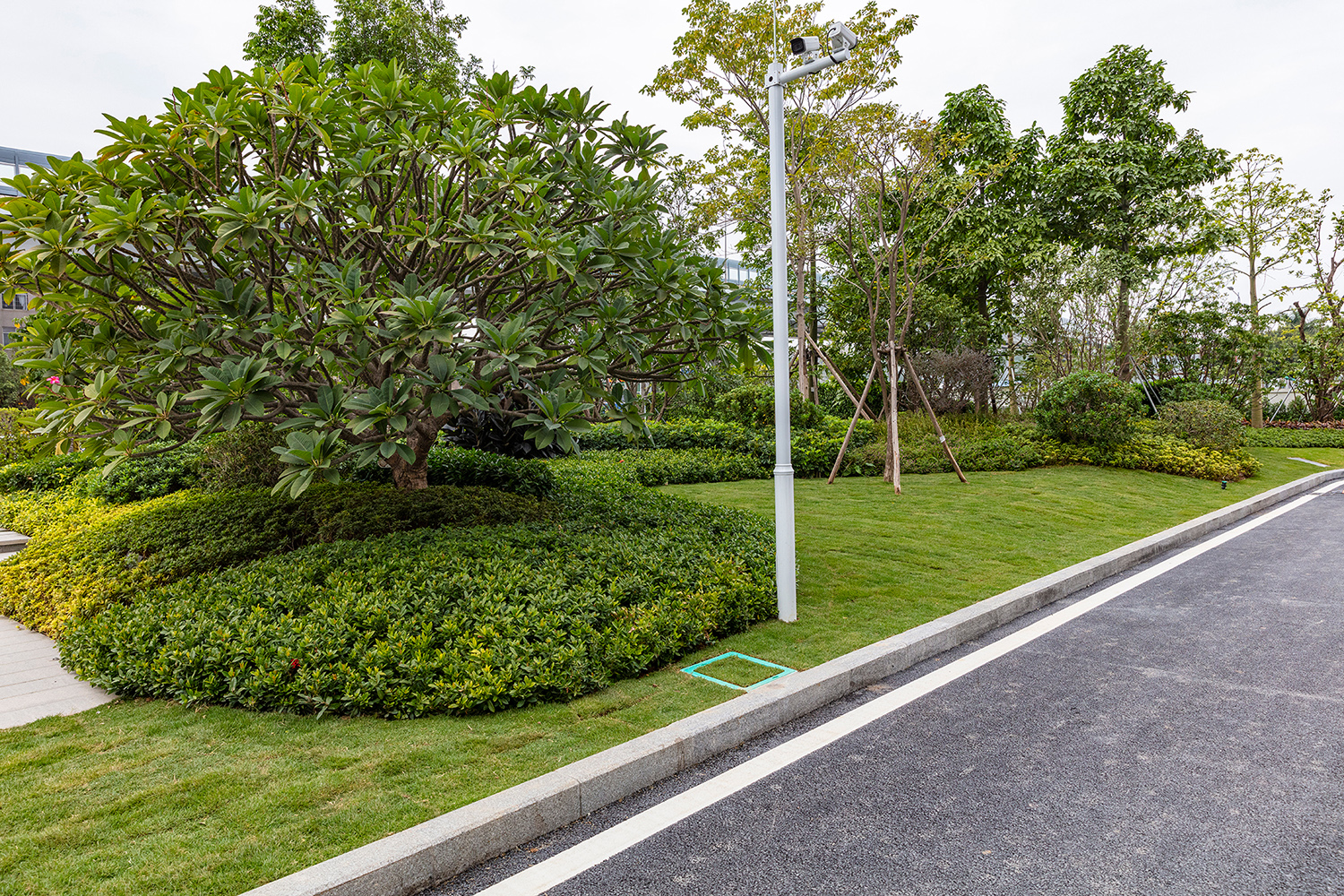整體景觀風格為現代簡約、通透規整為主,項目小,功能全。園建工程在開闊的空間運用幾何元素劃分各功能分區,鋪裝面整體色調協調統一,架空層休閑區和兒童活動區色彩豐富;綠化分布通透清新,疏林草地注重地形與喬木空間關系,運用喬木組建天際線和深景關系,地被色塊注重幾何關系,采用二級微地形強調下層苗木的視覺效果,簡約而不雜亂,精致而不單一。此風格對后期園區養護和安全管理都有很大好處,避免了園林植物帶容易藏污納垢和蚊蟲滋生的問題。