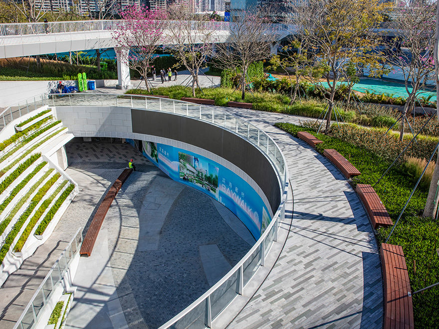 濱海廊橋總面積約13萬平方米,是深圳市寶安區政府打造的重要民生工程,也是深圳首個高線城市公園,在城市綠地上空建設二層連廊作為高線,通過連續的立體空間,將濱海活力延伸至城區內,打造灣區開放、共享的生態城市公園。是全國首個地下、地面、地上三層立體復合城市綠廊,也是深圳首個集交通、生態、觀景、服務、藝術、運動、社交等城市功能為一體的城市公共空間。