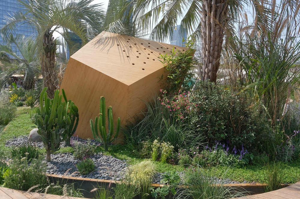 本展園是由烏拉圭園林設計大師阿里漢德羅·奧尼爾、葆拉·里爾和我國香港設計師胡慧中聯(lián)合設計的花園,名為“余境”,意為冰冷突兀的城市建筑被大自然修復的過程,旨在喚醒大家的意識,讓城市地融入自然環(huán)境當中,提倡打造一種人與自然之間的和諧共處關系。“余境”的整體構(gòu)圖受中國傳統(tǒng)圖案的啟發(fā),種植方案的靈感來自烏拉圭典型生態(tài)系統(tǒng)——著名的布迪椰子樹林。以特色布迪椰子樹為主的野生自然風光,配以象征著大灣區(qū)城市景觀的“亭臺樓閣”,印證了城市發(fā)展與自然相互作用、茁壯共生的緊密關系。